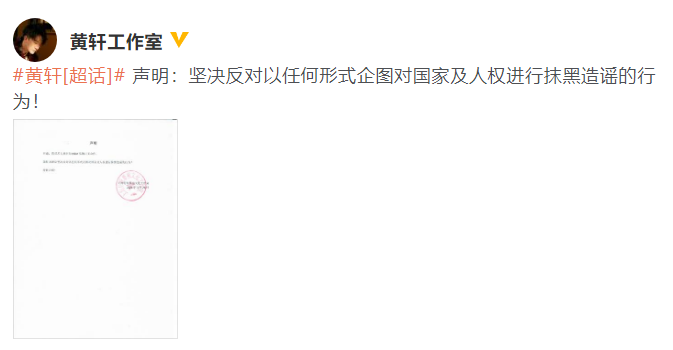 3月24日,黄轩工作室发表声明称,目前黄轩与HM没有任何合作。黄轩和他的团队表示,他们坚决反对任何抹黑国家和人权的企图。