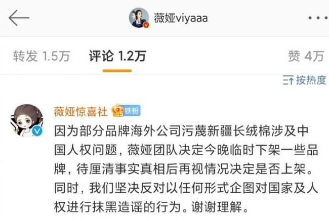 3月24日,H&M抵制新疆棉一事引众怒,晚间,薇娅方发文宣布直播间下架涉及污蔑新疆棉品牌:“待厘清事实真相后再视情况决定是否上架。同时,我们坚决反对以任何形式企图对国家及人权进行抹黑造谣的行为。”