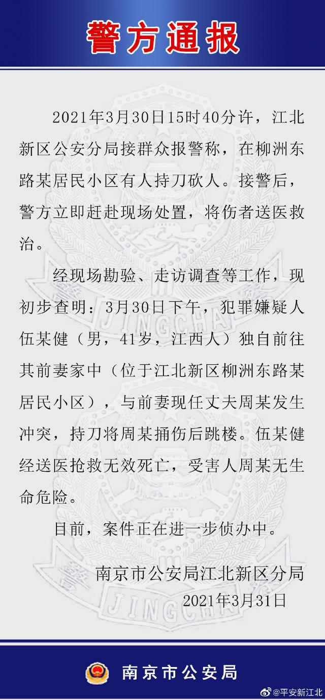 经现场勘验、走访调查等工作,现初步查明: 3月30日下午,犯罪嫌疑人伍某健(男,41岁,江西人)独自前往其前妻家中(位于江北新区柳洲东路某居民小区),与前妻现任丈夫周某发生冲突,持刀将周某插伤后跳楼。伍某健经送医抢救无效死亡,受害人周某无生命危险。