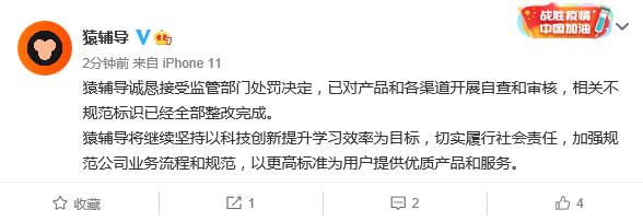 猿辅导官微消息,猿辅导刚刚对被顶格罚款一事发布通报称,猿辅导诚恳接受监管部门处罚决定,已对产品和各渠道开展自查和审核,相关不规范标识已经全部整改完成。