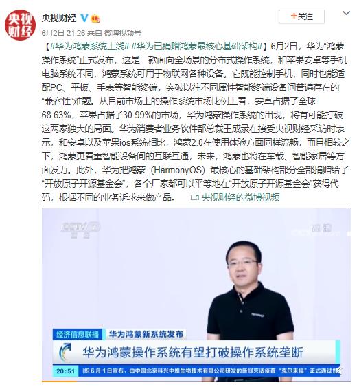 【#华为鸿蒙系统上线# #华为已捐赠鸿蒙最核心基础架构#】6月2日,华为“鸿蒙操作系统”正式发布,这是一款面向全场景的分布式操作系统,和苹果安卓等手机电脑系统不同,鸿蒙系统可用于物联网各种设备。它既能控制手机,同时也能适配PC、平板、手表等智能终端,突破以往不同属性智能终端设备间普遍存在的“兼容性”难题。从目前市场上的操作系统市场比例上看,安卓占据了全球68.63%,苹果占据了30.99%的市场,华为鸿蒙操作系统的出现,将有可能打破这两家独大的局面。
